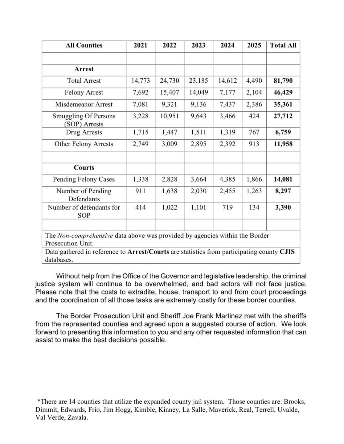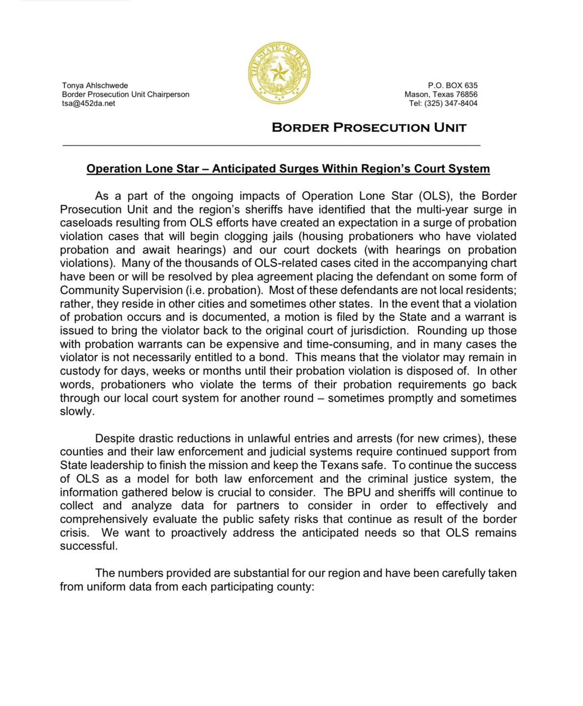We want to call your attention to a recent announcement by the Texas Border Prosecution Unit— attempting to alert Texas leadership to a brewing crisis in Border courtrooms.