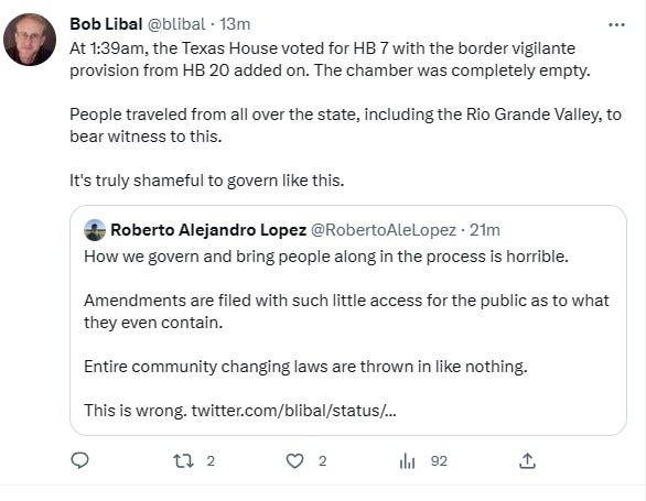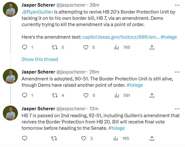 Couldn’t let the day dawn without marking current events at the Capitol in Austin. Lawmakers went deep into the night on House Bill 20— the controversial proposal to create a “Border Protection Unit,” that would basically act as some kind of a State of Texas Border Patrol.